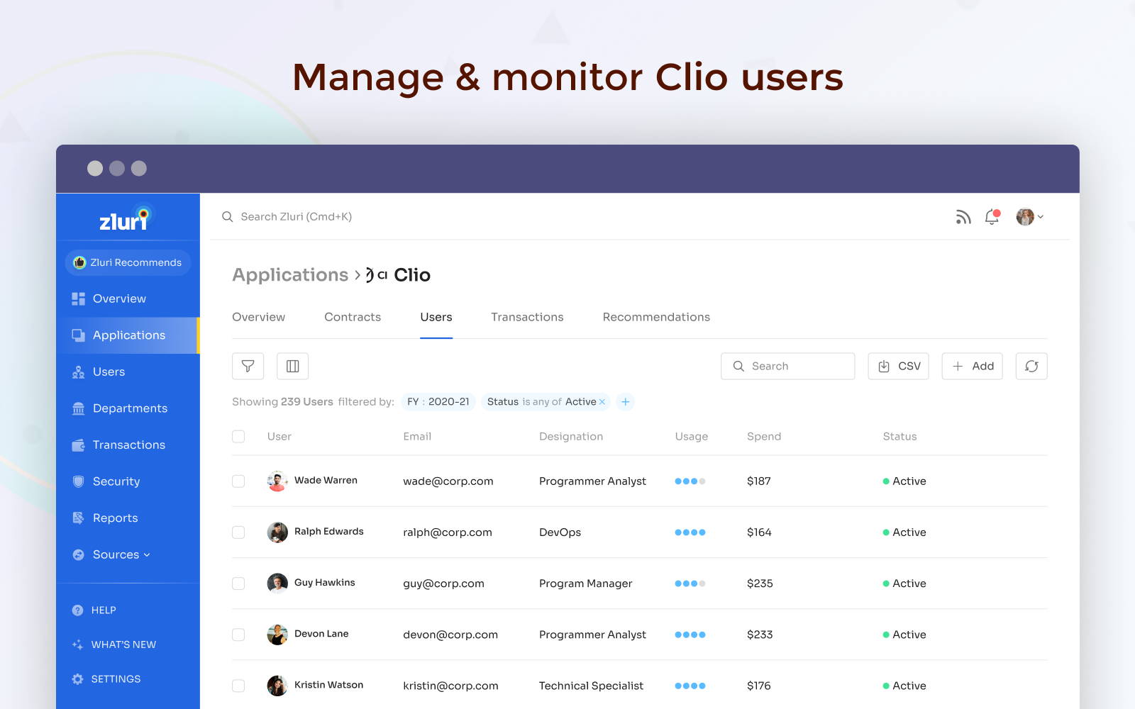 Zluri is a comprehensive SaaS management platform for IT teams. It enables IT teams to discover, manage, secure, and comply across multiple SaaS applications, all from a single dashboard.With direct integration with Clio , you can easily track which users hold Clio licenses, how frequently they use Clio , and which features they are using. The Zluri + Clio integration offers detailed usage and engagement metrics for each user in your organization. Also, you can manage license ownership and provision Clio accounts for users.Key Features:• Discover which users hold Clio licenses in your organization and how frequently they use them.• Identify inactive users and unused licenses in order to secure your application stack.• Enforce Clio usage policy across the organization & get security alerts on violation of policies.• Manage Clio licenses, monitor the amount spent , and track upcoming renewals from a single dashboard.
