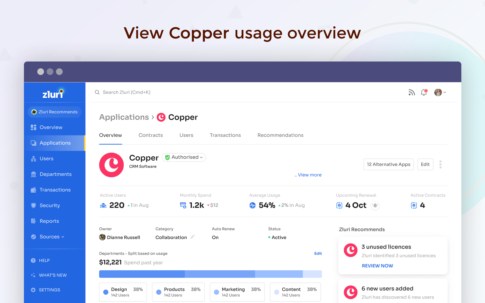 Zluri is a comprehensive SaaS management platform for IT teams. It enables IT teams to discover, manage, secure, and comply across multiple SaaS applications, all from a single dashboard.With direct integration with Copper , you can easily track which users hold Copper licenses, how frequently they use Copper , and which features they are using. The Zluri + Copper integration offers detailed usage and engagement metrics for each user in your organization. Also, you can manage license ownership and provision Copper accounts for users.Key Features:• Discover which users hold Copper licenses in your organization and how frequently they use them.• Identify inactive users and unused licenses in order to secure your application stack.• Enforce Copper usage policy across the organization & get security alerts on violation of policies.• Manage Copper licenses, monitor the amount spent , and track upcoming renewals from a single dashboard.