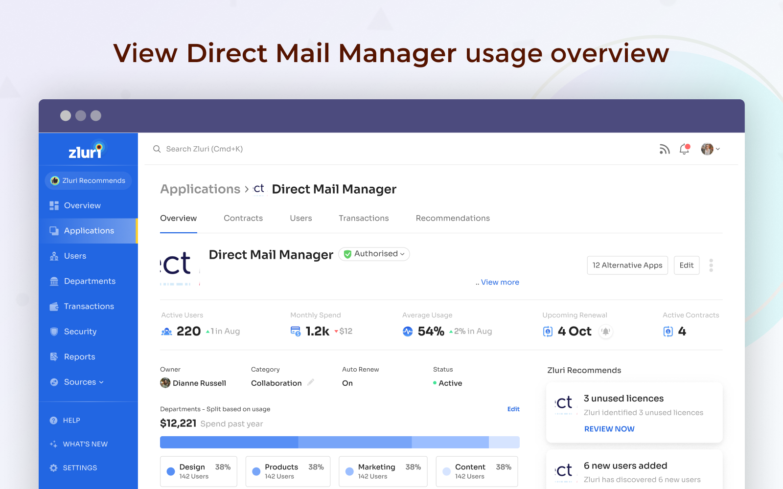 With direct integration with Direct Mail Manager, you can easily track which users hold Direct Mail Manager licenses, how frequently they use Direct Mail Manager, and which features they are using. The Zluri + Direct Mail Manager integration offers detailed usage and engagement metrics for each user in your organization. Also, you can manage license ownership and provision Direct Mail Manager accounts for users.