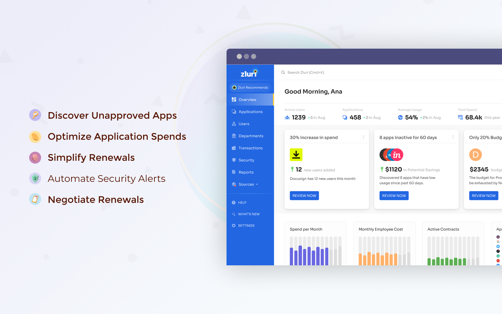 Zluri is a comprehensive SaaS Operations management platform for IT teams. It enables IT teams to discover, manage, secure, and comply across multiple SaaS applications, all from a single dashboard.With direct integration with Docusign, you can easily track which users hold Docusign licenses, how frequently they use Docusign, and which features they are using. The Zluri + Docusign integration offers detailed usage and engagement metrics for each user in your Docusign organization. Also, you can manage license ownership and provision Docusign accounts for users.Key Features: