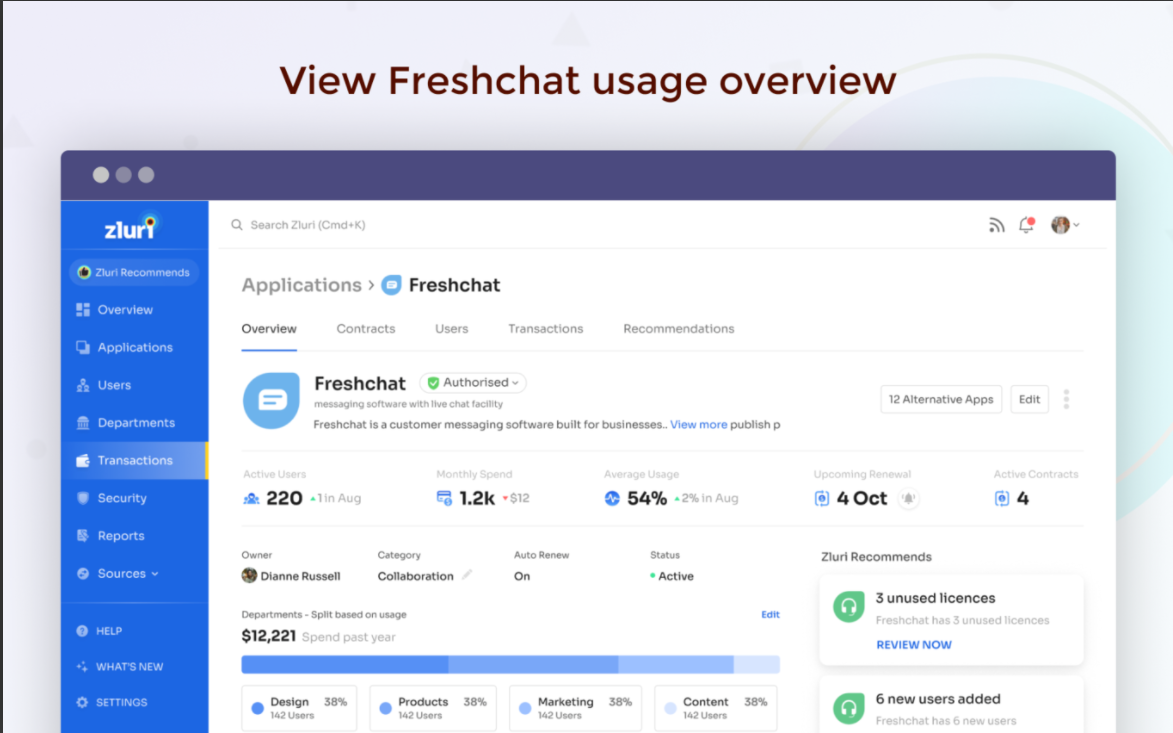 Zluri is a comprehensive SaaS management platform for enterprises. It enables IT teams to discover, manage, secure, and comply across multiple SaaS applications, all from a single dashboard.With direct integration with Freshchat, you can easily track which users hold Freshchat licenses, how frequently they use Freshchat, and which features they are using. The Zluri + Freshchat integration offers detailed usage and engagement metrics for each user in your Freshchat organization. Also, you can manage license ownership and provision Freshchat accounts for users.Key Features: