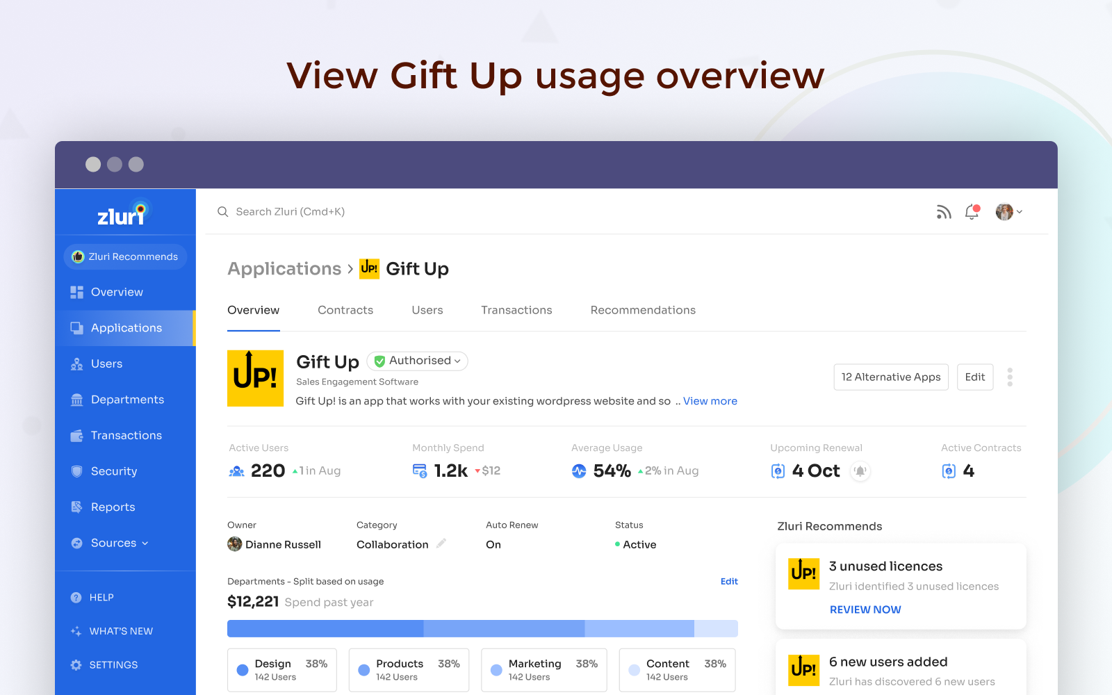 Zluri is a comprehensive SaaS Operations management platform for IT teams. It enables IT teams to discover, manage, secure, and comply across multiple SaaS applications, all from a single dashboard.With direct integration with Gift Up, you can easily track which users hold Gift Up licenses, how frequently they use Gift Up, and which features they are using. The Zluri + Gift Up integration offers detailed usage and engagement metrics for each user in your Gift Up organization. Also, you can manage license ownership and provision Gift Up accounts for users.Key Features: