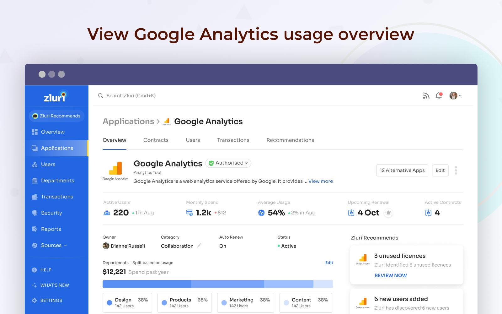 - Manage GoogleAnalytics licenses, monitor the amount spent , and track upcoming renewals from a single dashboard.