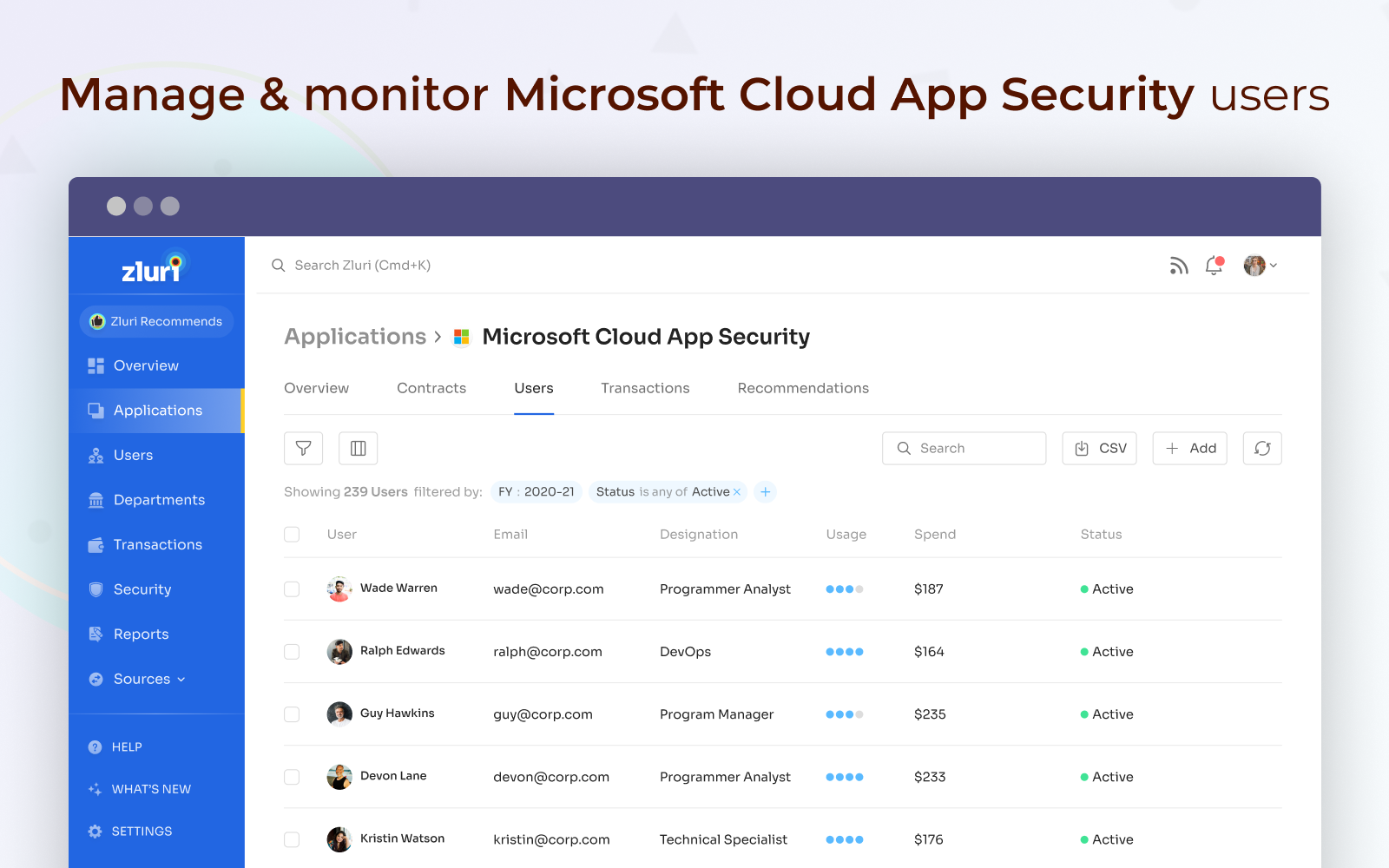 Zluri is a comprehensive SaaS Operations management platform for IT teams. It enables IT teams to discover, manage, secure, and comply across multiple SaaS applications, all from a single dashboard.With direct integration with Microsoft Cloud App Security, you can easily track which users hold Microsoft Cloud App Security licenses, how frequently they use Microsoft Cloud App Security, and which features they are using. The Zluri + Microsoft Cloud App Security integration offers detailed usage and engagement metrics for each user in your Microsoft Cloud App Security organization. Also, you can manage license ownership and provision Microsoft Cloud App Security accounts for users.Key Features: