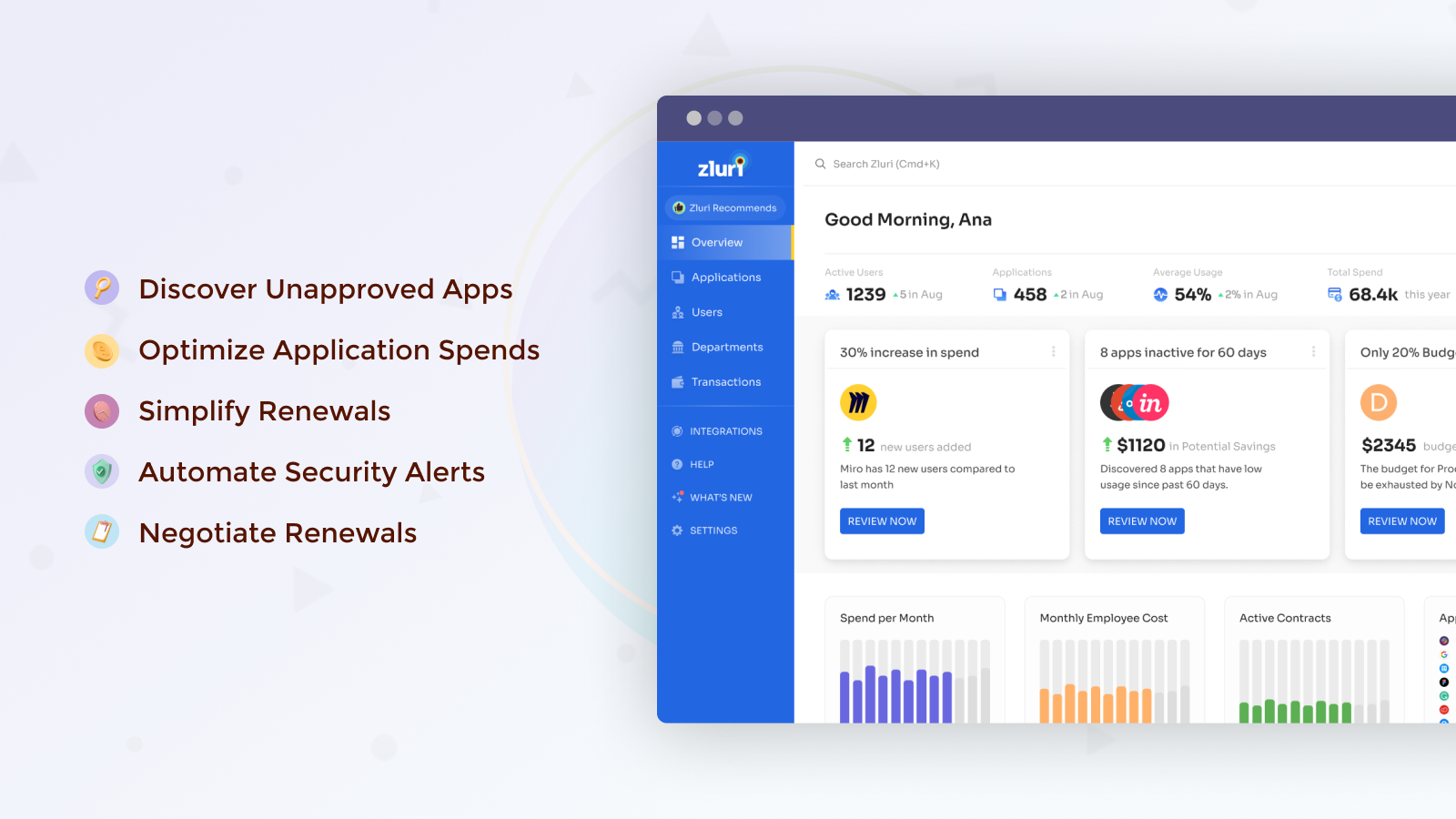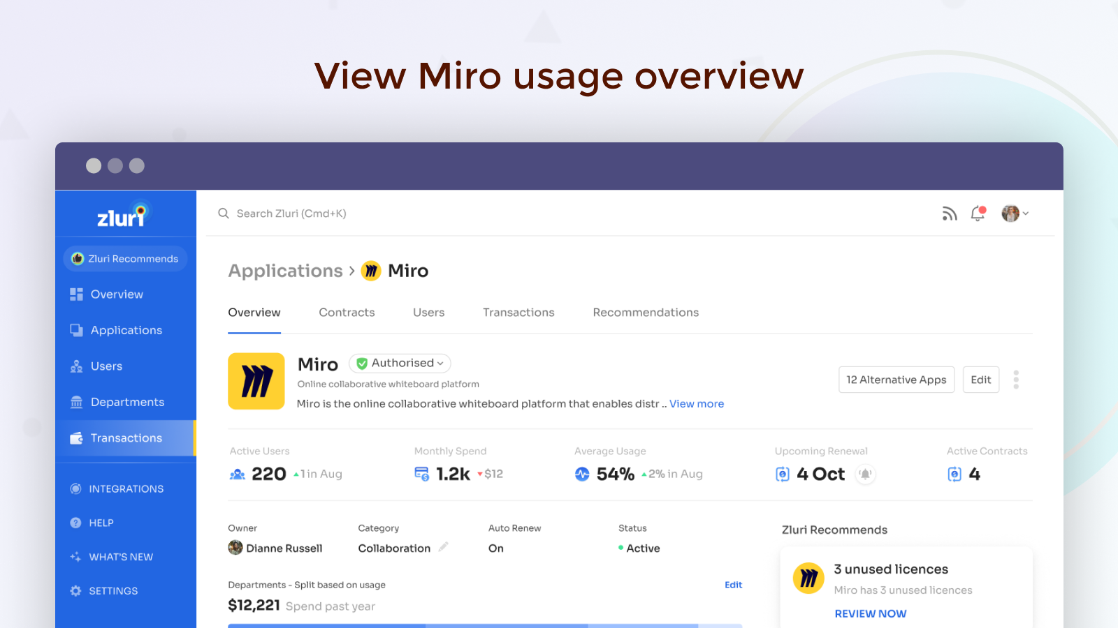 Zluri is a comprehensive SaaS management platform for enterprises. It enables IT teams to discover, manage, secure, and comply across multiple SaaS applications, all from a single dashboard.Through direct integration with Miro, you can easily track which users hold Miro licenses, how frequently they use Miro & which features they are using. You will get detailed usage & engagement metrics for each user on the Miro platform. Also, you can manage license ownership and provision Miro accounts for users.Key Features: