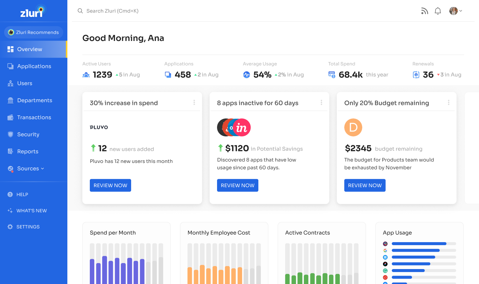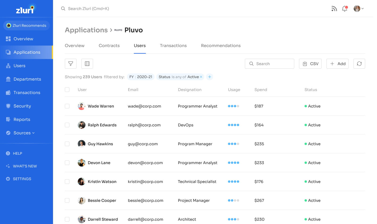 Zluri is a comprehensive SaaS Operations management platform for IT teams. It enables IT teams to discover, manage, secure, and comply across multiple SaaS applications, all from a single dashboard.With direct integration with Pluvo, you can easily track which users hold Pluvo licenses, how frequently they use Pluvo, and which features they are using. The Zluri + Pluvo integration offers detailed usage and engagement metrics for each user in your Pluvo organization. Also, you can manage license ownership and provision Pluvo accounts for users.Key Features: