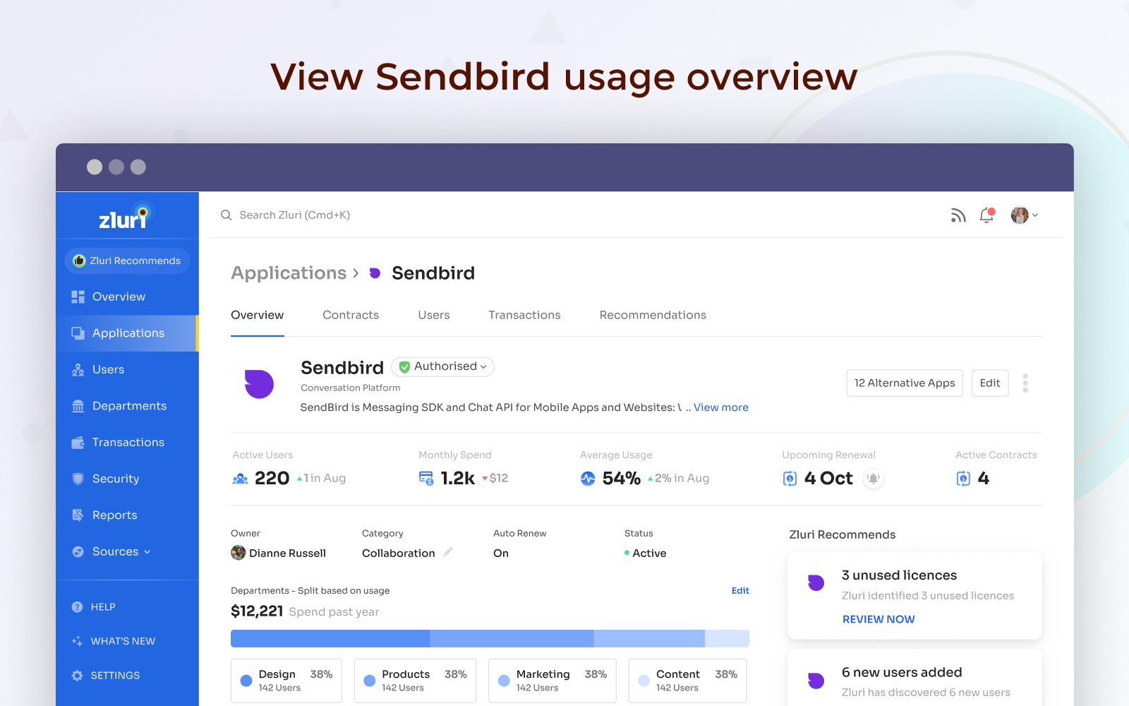 - Manage Sendbird licenses, monitor the amount spent , and track upcoming renewals from a single dashboard.