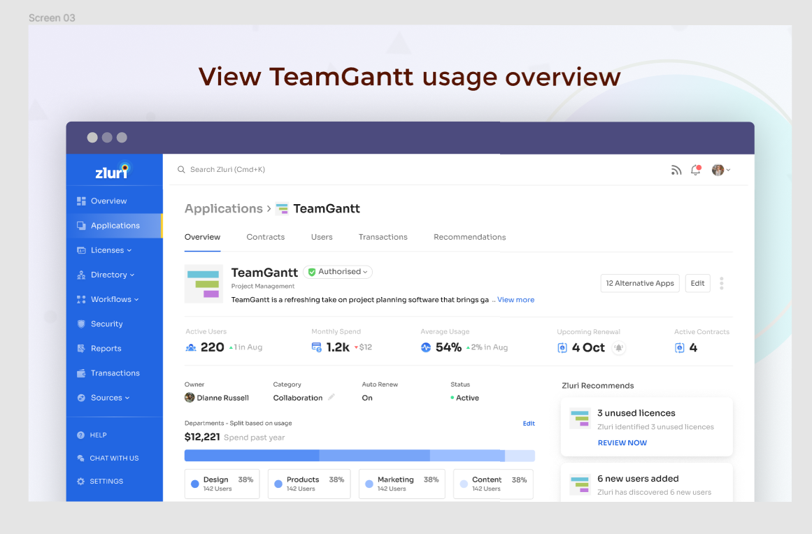 - Manage TeamGantt licences, monitor the amount spent, and track upcoming renewals from a single dashboard.