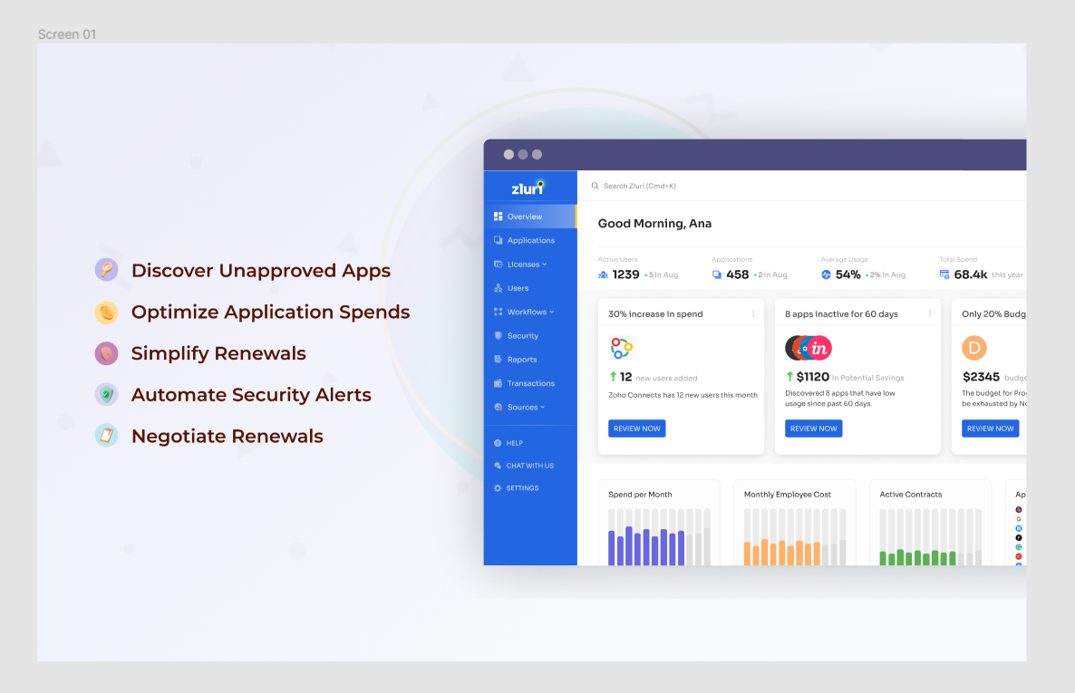 Zluri is an enterprise SaaS management platform for IT teams. It enables IT teams to discover, manage, secure, and comply across multiple SaaS applications from a single dashboard. It also helps you automate SaaS Operations Tasks like user onboarding & offboarding. With direct integration with Zoho Connect, you can discover the Zoho Connect users and their usage. You can track licenses, optimize spend & plan for your future requirements.