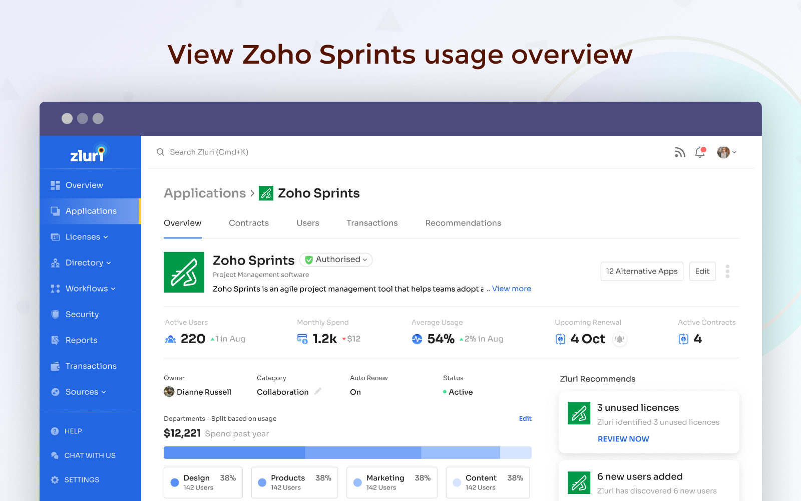 - Manage Zoho Sprints licences, monitor the amount spent, and track upcoming renewals from a single dashboard.