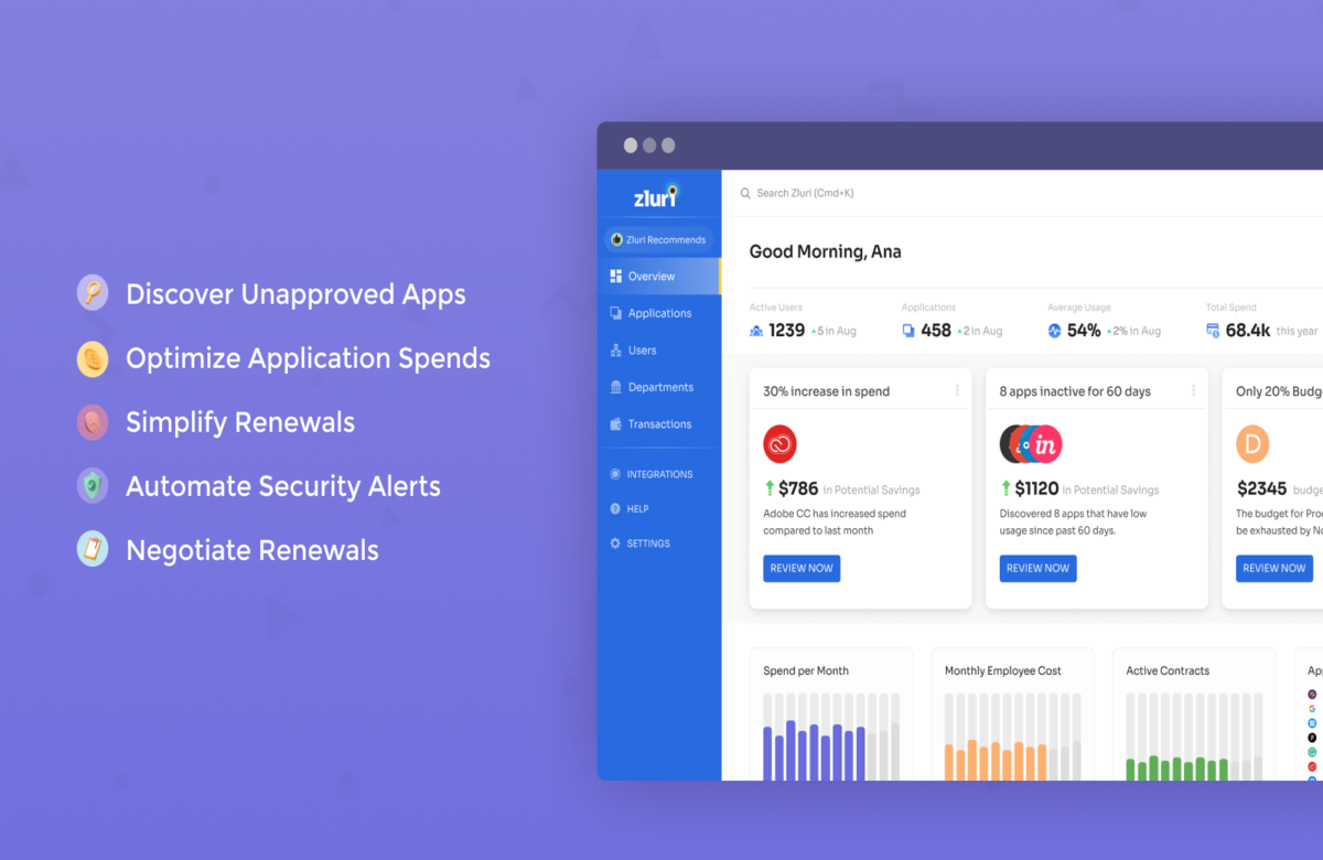 Zluri is a comprehensive SaaS management platform for enterprises. It enables IT teams to discover, manage, secure, and comply across multiple SaaS applications, all from a single dashboard.Through direct integration with Zoom, you can easily track which users hold Zoom licenses, how frequently they use Zoom & which features they are using. You will get detailed usage & engagement metrics for each user on the Zoom platform. Also, you can manage license ownership and provision Zoom accounts for users.Key Features:
